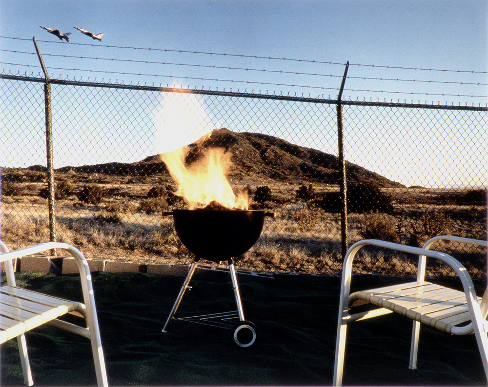 F-16 Falcons (U.S.A.F. Thunderbird Team), Residential Backyard Facing Hollowed-out Manzano Mountain Nuclear Storage Area, Kirtland A.F.B., Albuquerque, New Mexico,1990 & 1993, Chromogenic print (Ilfocolor Deluxe), 17 X 22 and 27 1/4 X 36 1/4