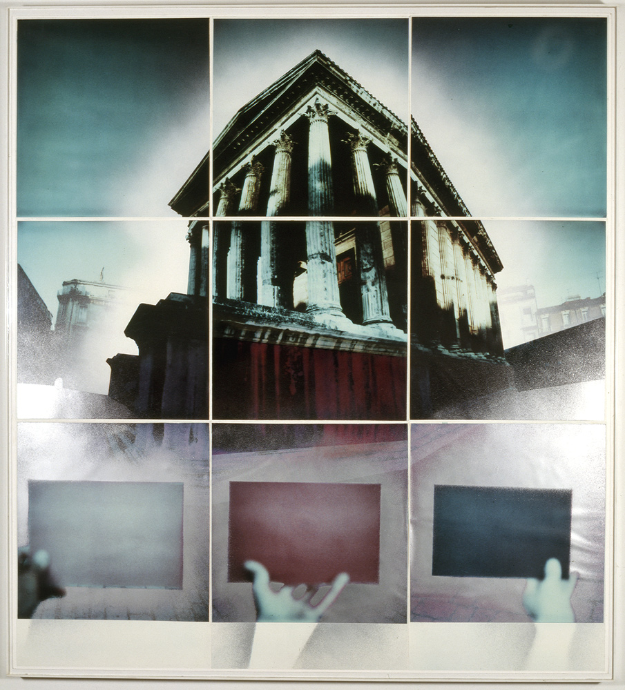 Maison Carree #1, Nimes, France, 1980, 36 X 33 X 2 1/2, nine P-12 Cibachrome prints from original SX-70's with mixed media (oils, enamels, watercolors, sprayed and selectively hand colored)