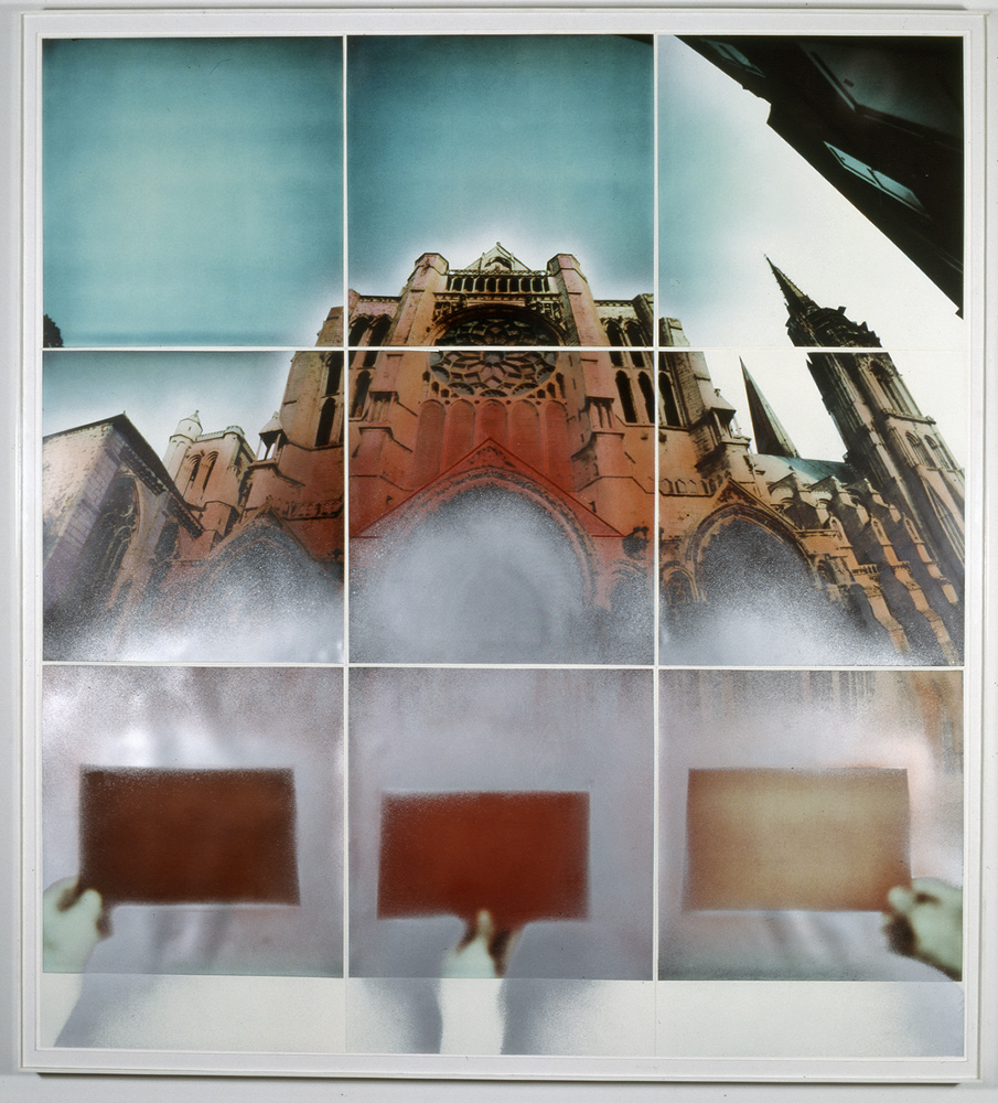Chartres, France #2, 1980, 36 X 33 X 2 1/2, nine P-12 Cibachrome prints from original SX-70's with mixed media (oils, enamels, watercolors, sprayed and selectively hand colored)