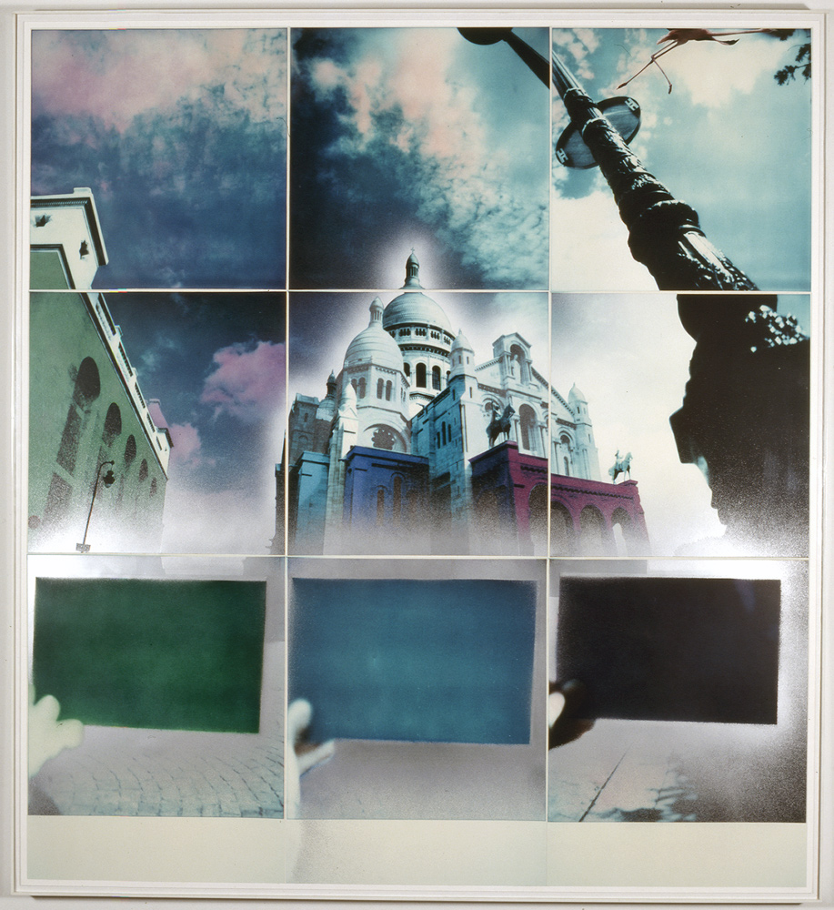 La Basilique Du Sacre-Coeur Sur La Butte Montmartre #1, 1980, 36 X 33 X 2 1/2, nine P-12 Cibachrome prints from original SX-70's with mixed media (oils, enamels, watercolors, sprayed and selectively hand colored)