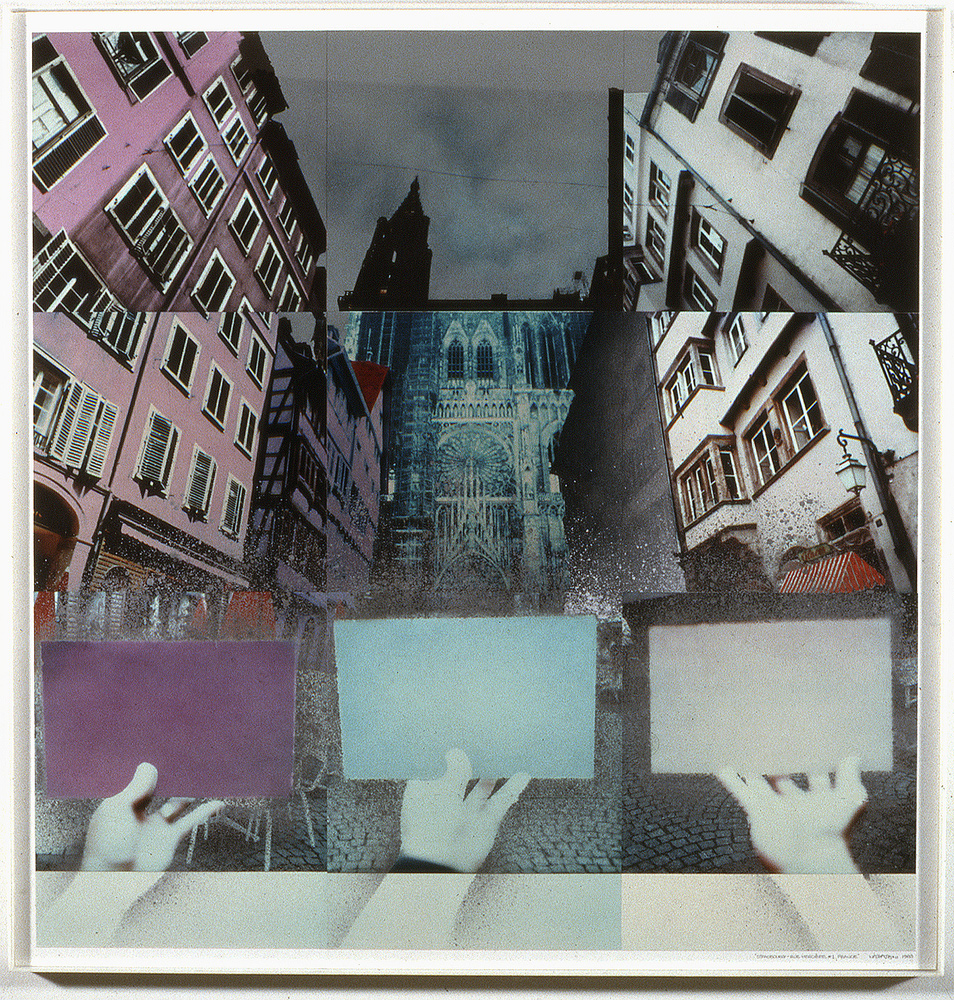 Strasbourg / Rue Merciere #1, France, 1980, 36 X 33 X 2 1/2, nine P-12 Cibachrome prints from original SX-70's with mixed media (oils, enamels, watercolors, sprayed and selectively hand colored)