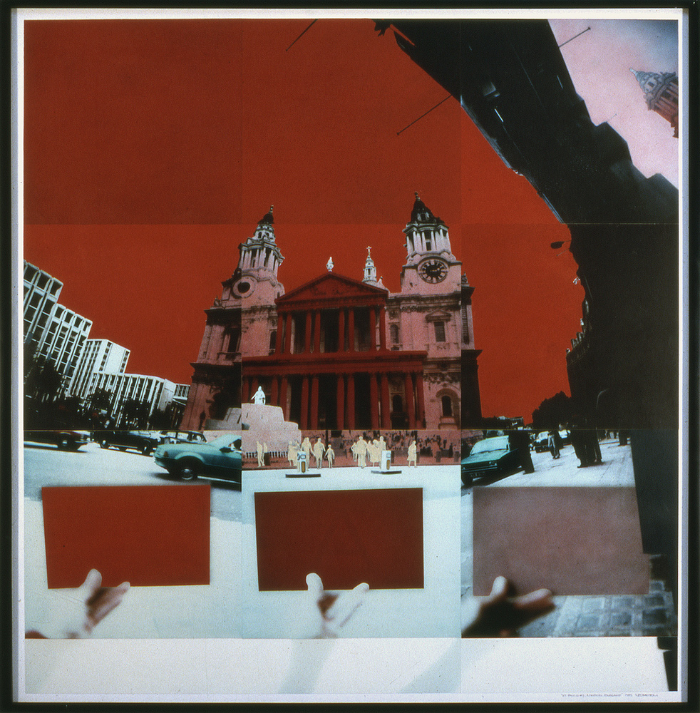 St. Pauls #2, London, England, 1983, 36 X 33 X 2 1/2, nine P-12 Cibachrome prints from original SX-70's with mixed media (oils, enamels, watercolors, sprayed and selectively hand colored)