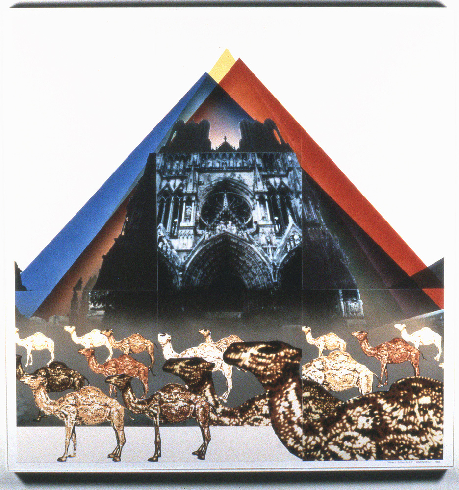 Reims, France #3, 1982, 36 X 33 X 2 1/2, nine P-12 Cibachrome prints from original SX-70's with mixed media (multiple printing, chalk, lacquer, enamel)