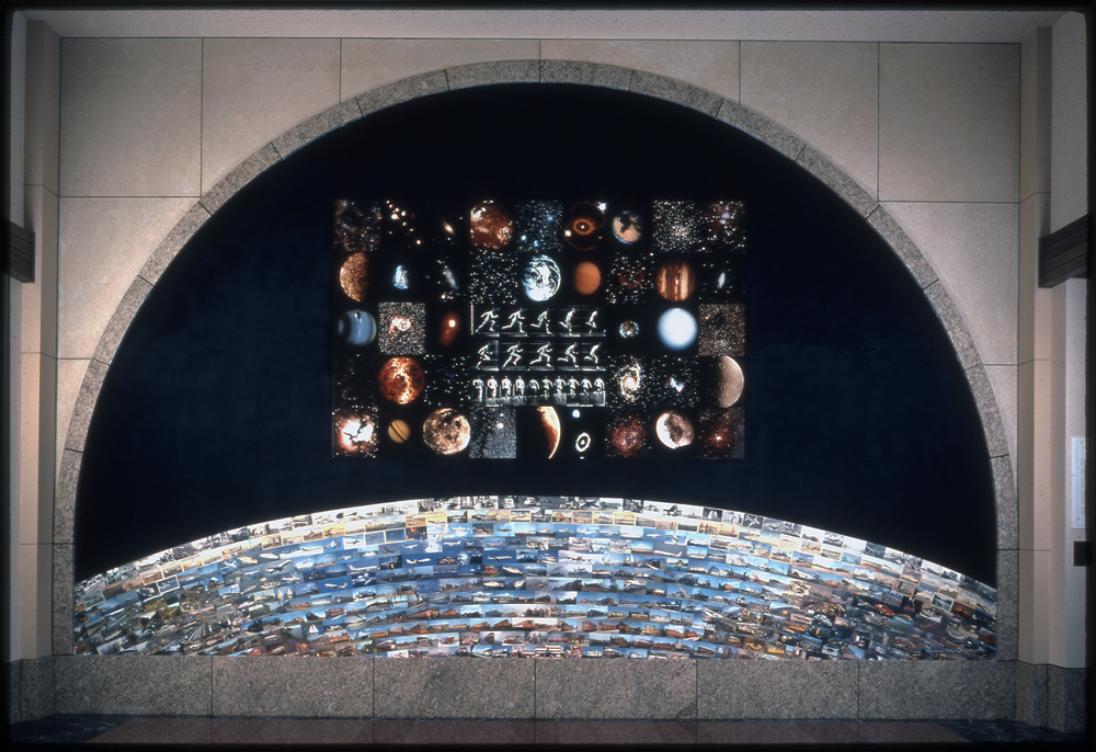 Epoch, 1995, 12' X 20', site specific photo mural permanent installation, 3rd floor entrance to Board room, Gateway Transit Center, MTA Headquarters building, Los Angeles, California, black canvas, Cibachrome Light Jet prints (3) 6' X 9' and 500 laminated postcards