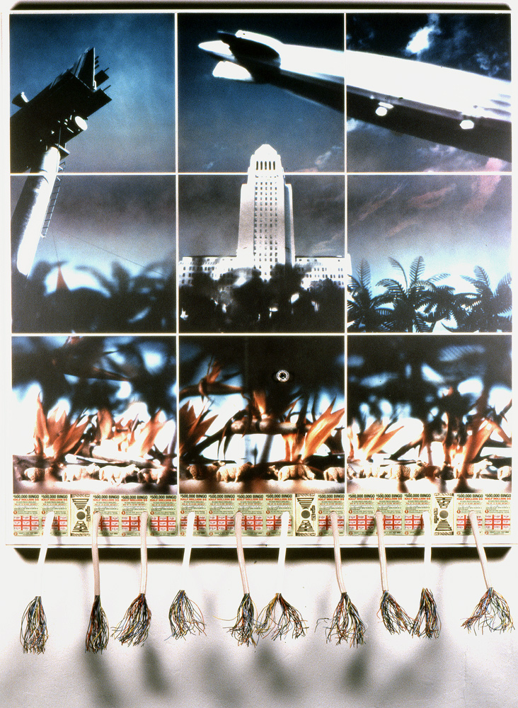 Los Angeles Bicentennial Piece, 1980, Cibachrome prints with hand altered surfaces, sculpted telephone wires, unused game cards, plexi container with 32cal. bullet hole. 60"X47"X2"